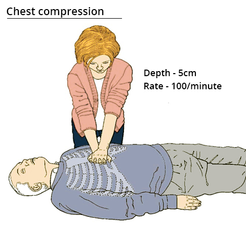 - Start chest compressions: place the heel of one of the hands in the centre of the chest, the lower half of the sternum – place the other hand on top – interlock fingers – arms straight – compress the chest at the rate of approximately 100 chest compressions per minute and 5-6 cm in depth. There should be a perfect balance between compression and relaxation. No pressure on the ribs!