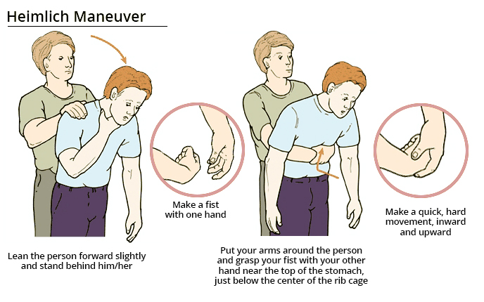 - Give 5 abdominal thrusts – Heimlich Maneuver: the first aider stands behind the victim with their arms around their waist, bending them forward. One fist needs to be clenched and placed above their belly button while the other hand is placed on top of their fist to pull sharply inwards and upwards.