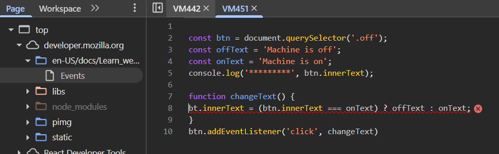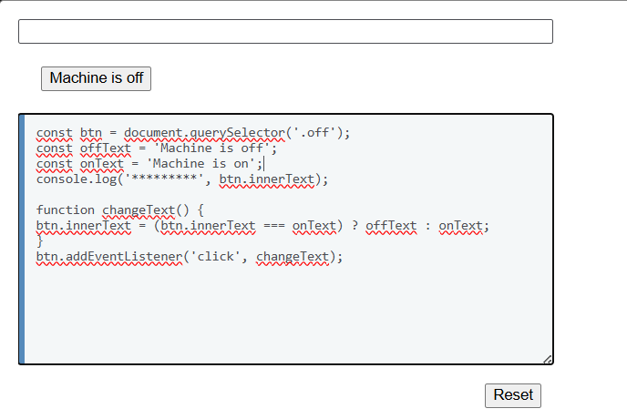 The Events 1 section has a small test where you are asked to create an event handler that will change the text on a button back and forward from “Machine is off” to “Machine is on”.